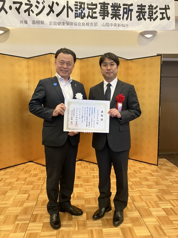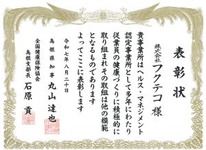 先日開催された「ヘルス・マネジメント認定事業所 表彰式」において、島根県内32事業所の一つとして、丸山島根県知事より表彰を受けました。
